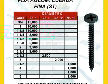 Pija de Cuerda Fina (S1): Se utiliza para fijar paneles de yeso a perfiles metálicos (postes y canales). Su punta es aguda para perforar el metal delgado.