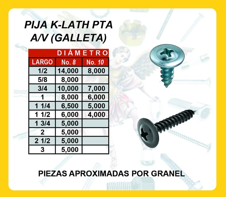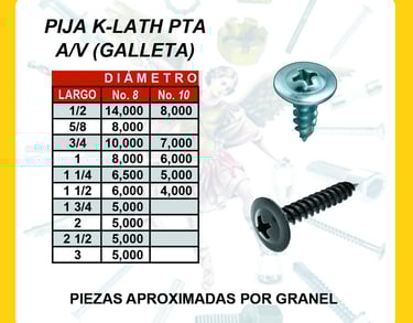 La pija K-Lath con punta aguda (tipo AB) es un tornillo autorroscante diseñado para fijar metal-metal o lámina delgada, comúnmente usado con malla de refuerzo y estructuras de yeso (metal stud). Cuenta con cabeza cónica/plana tipo Phillips (cruz) y punta afilada para iniciar la perforación, disponible en acabado galvanizado o fosfatado