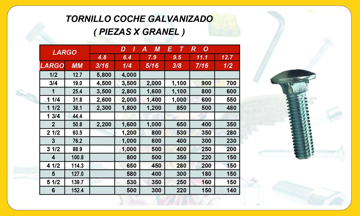 El tornillo de cabeza de coche esta diseñado con una cabeza redonda y lisa, y un cuello cuadrado justo debajo que evita que el tornillo gire al apretar la tuerca. Su acabado galvanizado le proporciona una capa protectora de zinc que lo hace altamente resistente a la corrosión, siendo ideal para aplicaciones en exteriores expuestas a la humedad